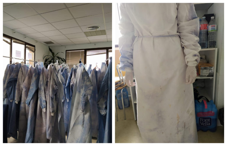 Estos EPIs, que son desechables y tendrían que tener un solo uso, continúan siendo utilizados por la escasez de material protector para los profesionales sanitarios. Con este proceso de desinfección, explican, la tela de las batas va perdiendo su porosidad y por lo tanto su eficacia para protegerse ante el riesgo de ser contagiados. Según informaron desde el Ministerio de Sanidad, hasta este martes, día 24, habría 5.400 profesionales sanitarios contagiados en todo el Sistema Nacional de Salud.