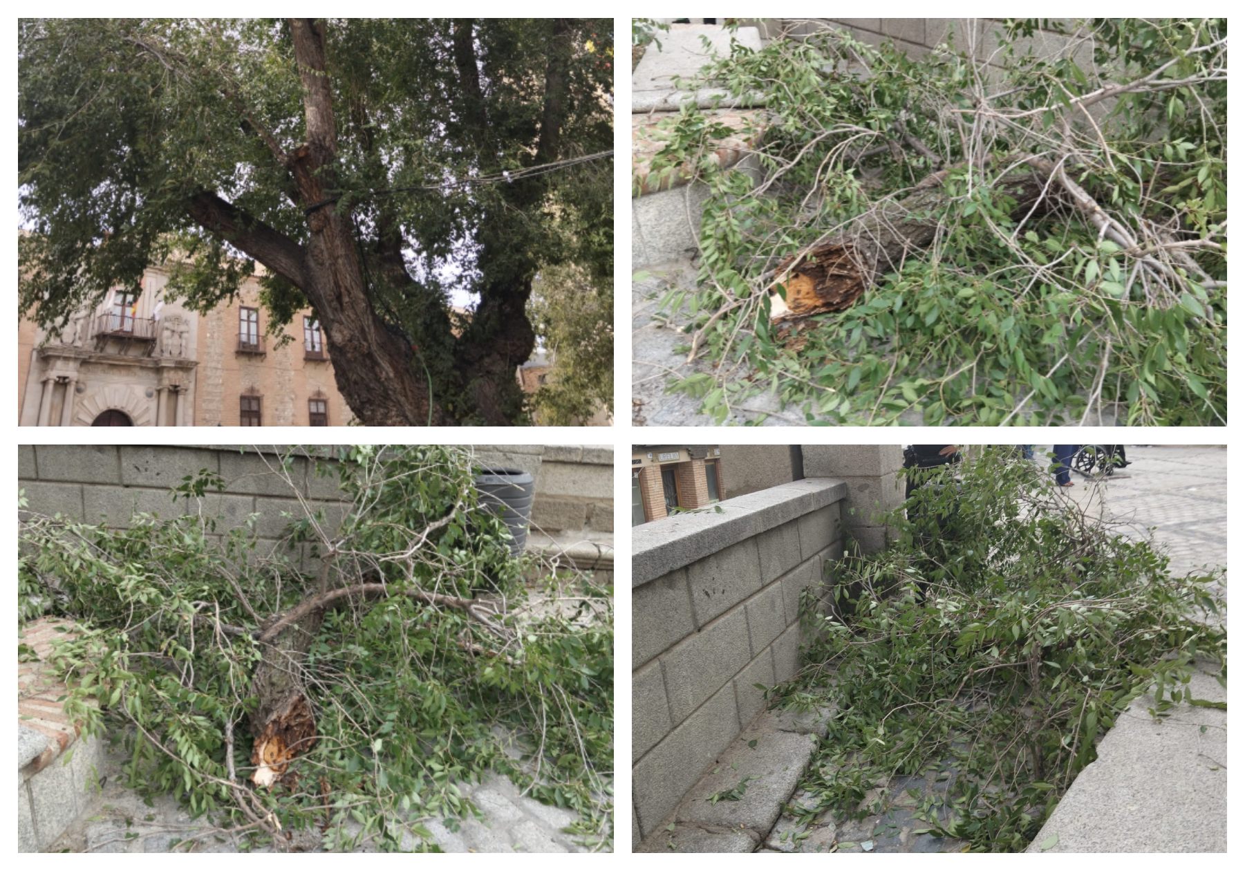 Uno de los pocos árboles que hay en la plaza del Ayuntamiento de Toledo sufrió este pasado viernes la rotura de una rama de grandes dimensiones que no afectó a ningún viandante. Se trata de un Olmo de Siberia (Ulmus pumila), uno de los dos que hay en este enclave, que tiene entre 40 y 50 años.