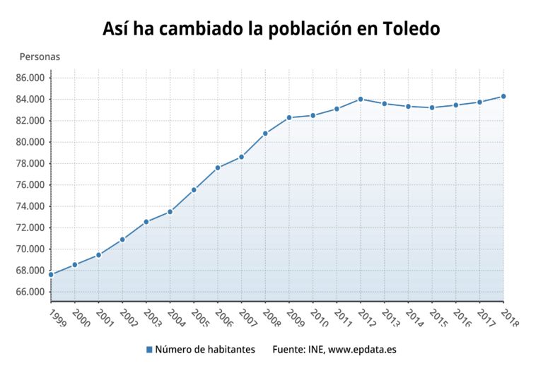 Según los datos de población que maneja el Ayuntamiento de Toledo, la capital regional ha aumentado su población en los últimos cuatro años en 1.261 habitantes tras alcanzar -a fecha de 1 de enero de 2018- un total de 84.597 habitantes. En el último año del que el Padrón Municipal de Habitantes tiene registro (2017), la población ha aumentado en 625 vecinos.