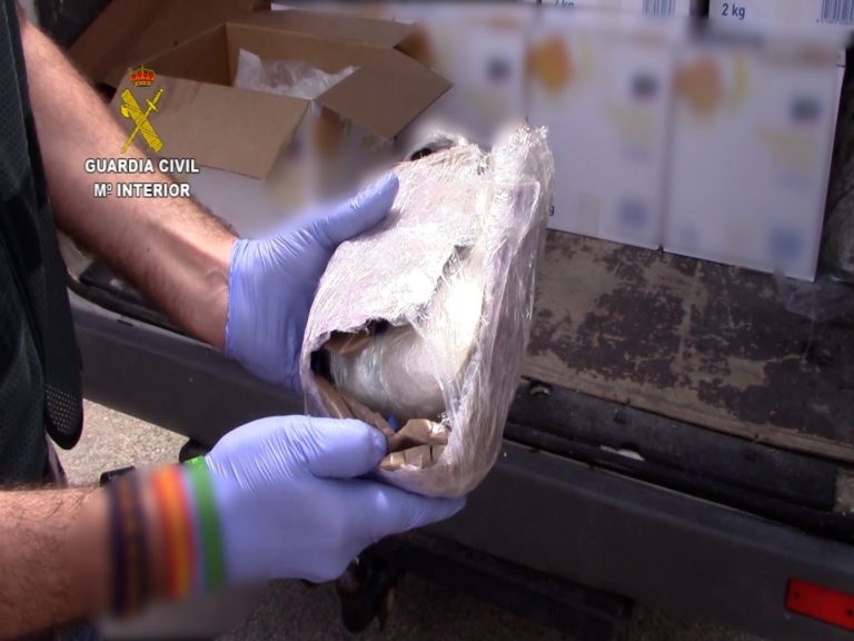 Ante la sospecha de que esta documentación no se ajustara a la realidad, la Guardia Civil inspeccionó el interior de la furgoneta, en la cual había 46 cajas que de cartón que contenían supuestamente patatas fritas industriales. Estos agentes de verificaron el contenido de todas estas cajas, hallando en una de ellas un paquete envuelto en plástico con unas medidas aproximadas de 14x20 centímetros y con un peso de unos 800 gramos.