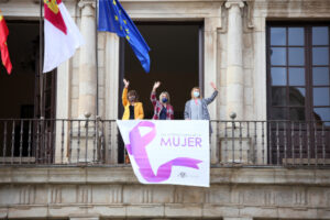 La alcaldesa coloca el lazo del 8M en el Ayuntamiento junto a la atleta Irene Sánchez Escribano 02/03/2021 | Toledodiario