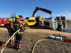 Un camión cisterna que transportaba 10.000 litros de gasoil vuelca a la altura de Noblejas 04/12/2024 | Europa Press