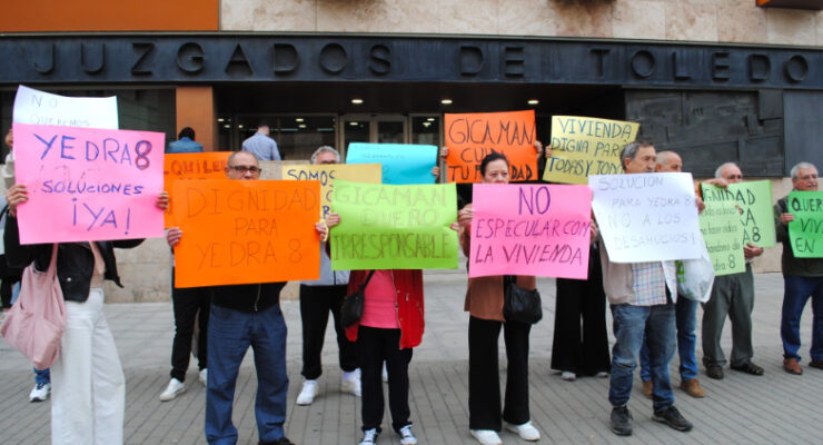 La Plataforma de Toledo por una Vivienda Digna ha protestado este lunes contra los dos nuevos juicios de desahucio contra dos familias de dicha promoción por el impago de alquileres