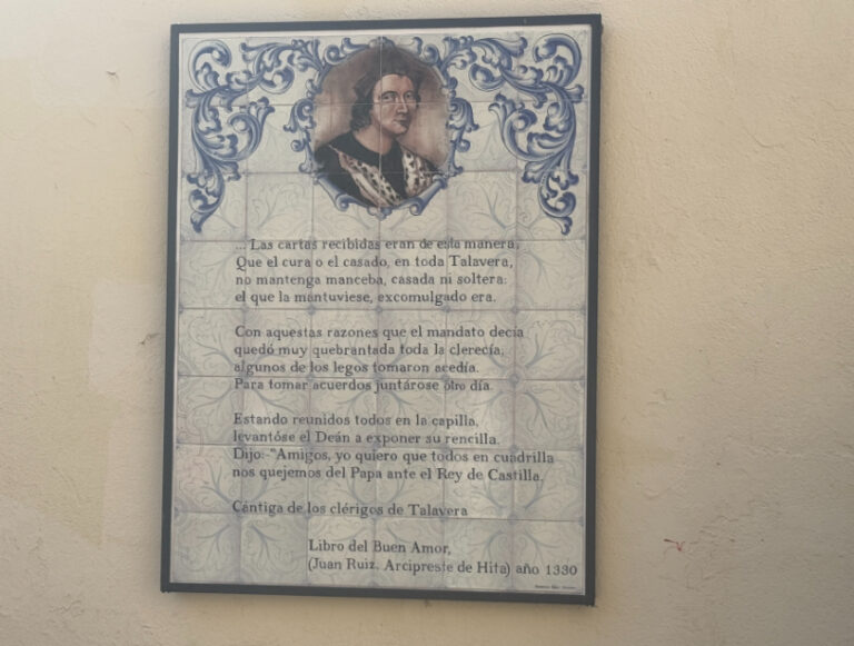 Talavera de la Reina conjuga su seña de identidad, la cerámica, con la literatura en un mural dedicado al Arcipreste de Hita y su Libro del Buen Amor, en el que muestra un fragmento de la Cántiga de los clérigos de la ciudad que puede leerse en esta obra.