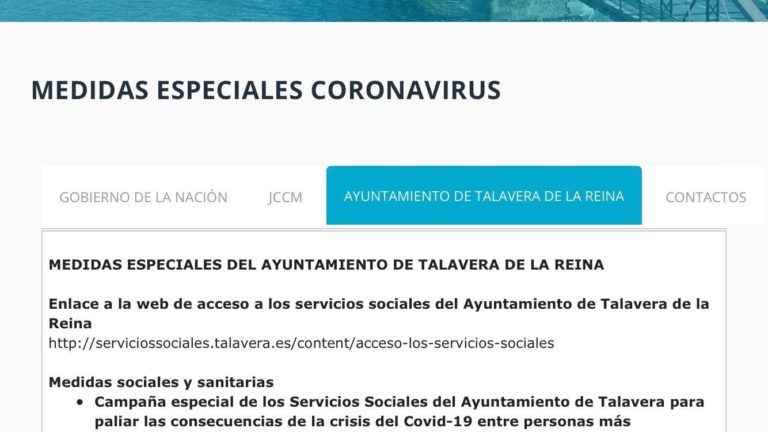 El Ayuntamiento de Talavera de la Reina ha habilitado un espacio en la web municipal que recoge las medidas adoptadas por las diferentes administraciones desde el inicio del estado de alarma, decretado por la pandemia provocada por el COVID-19.