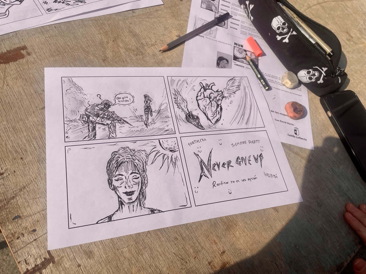 El ilustrador freelance y autor de cómics toledano, David Marto, es el encargado de la parte creativa de la actividad. "En el taller estamos primero dando unas nociones básicas de cómic, cuatro recursos quizás, tipos de planos, ángulos. A partir de ahí hemos repartido unas plantillas con cuatro o seis viñetas para que ellos puedan plasmar lo que les inspiran estas historias" asegura el ilustrador.