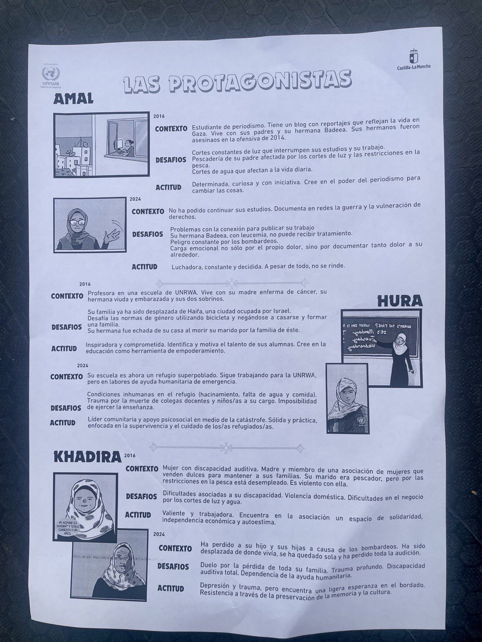Las historias, luchas y resistencias de cinco mujeres palestinas han sido las protagonistas de las jornadas. Amal, una estudiante de periodismo que no ha podido finalizarlos; Hura, profesora en una escuela que se ha convertido en un refugio superpoblado; Khadira, con discapacidad auditiva, ha perdido a su hijo y sus hijas a causa de los bombardeos; Hazeem, una joven estudiante atleta que se quedó sin pierna después de que una bomba destruyera su casa; y Nur, una recién nacida, sobrina de Hura, refugiada en una escuela de UNRWA.