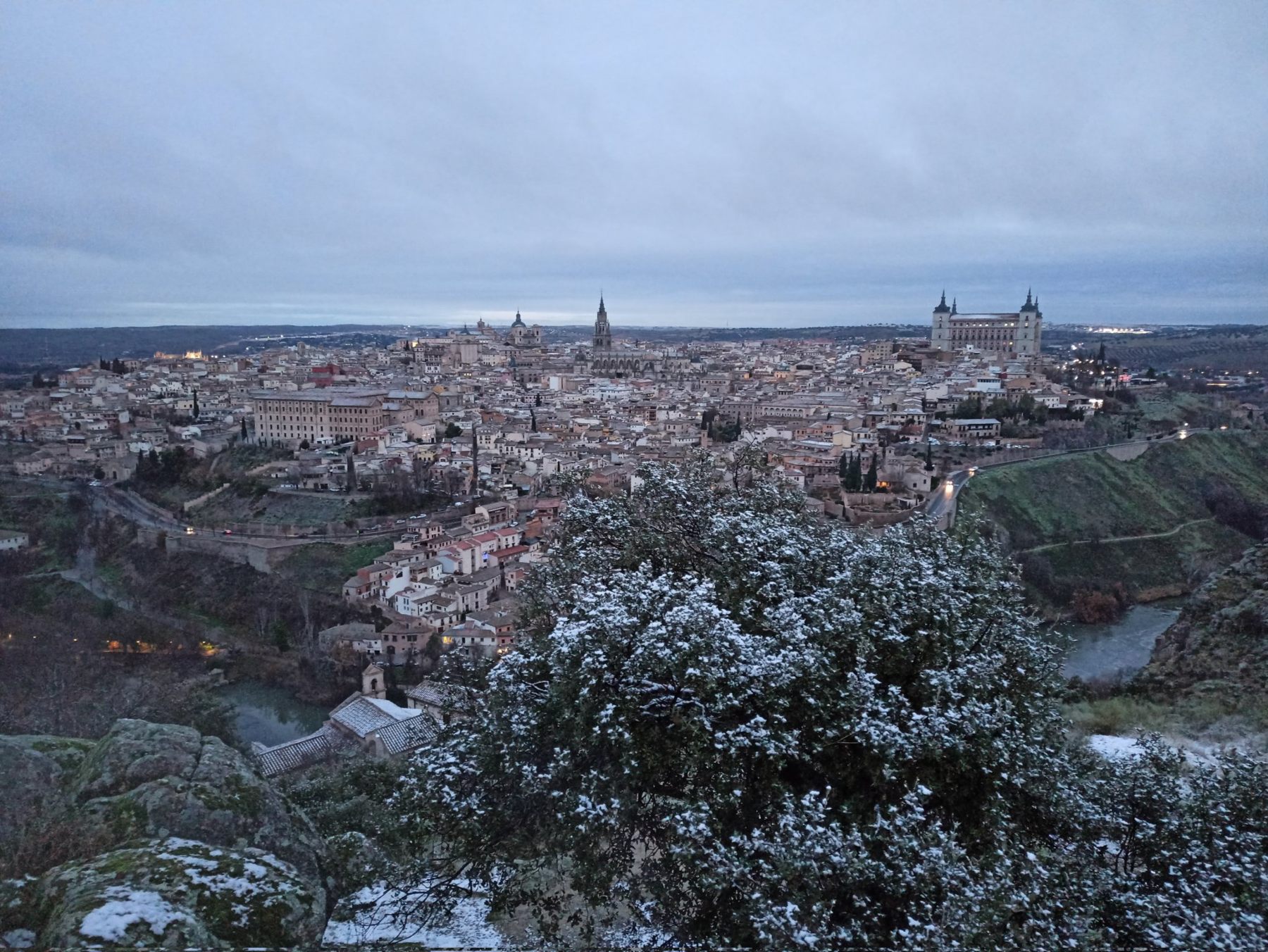 Amanece en #Toledo bajo una ligerísima capa blanca que no tapa, solo insinúa. La nieve se posa con pudor sobre coches, árboles y tejados, como si no quisiera romper la armonía de la ciudad.