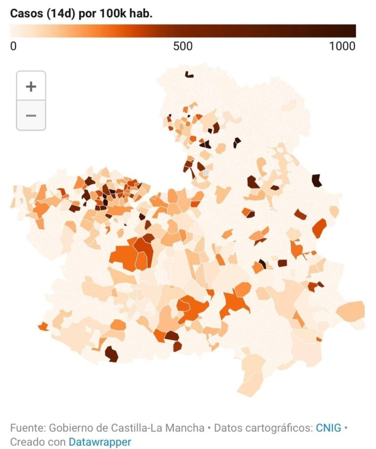 En el mapa que te ofrecemos a continuación puede conocerse la situación, municipio a municipio. Destacan algunos lugares por estar en riesgo extremo de contagios, como Salvacañete, en Cuenca con 1.311 casos por 100.000 habitantes, Salmerón en Guadalajara, con 1.429 casos por 100.000 habitantes, Huecas (Toledo) con 1.247 casos o Pozoamargo en Albacete, con 1.034 casos por 100.000 habitantes.