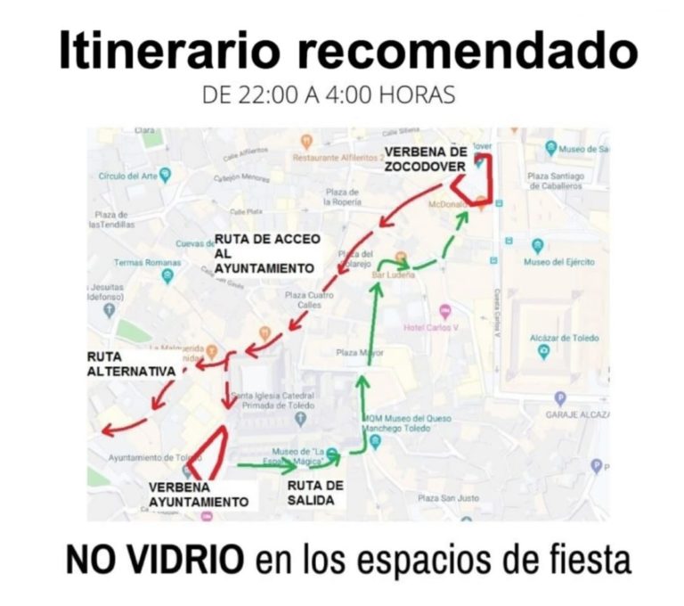 En este sentido, debido a la coincidencia de dos espectáculos de orquestas al unísono en las plazas de Zocodover y Ayuntamiento, se recomienda a los asistes seguir el siguiente circuito peatonal: