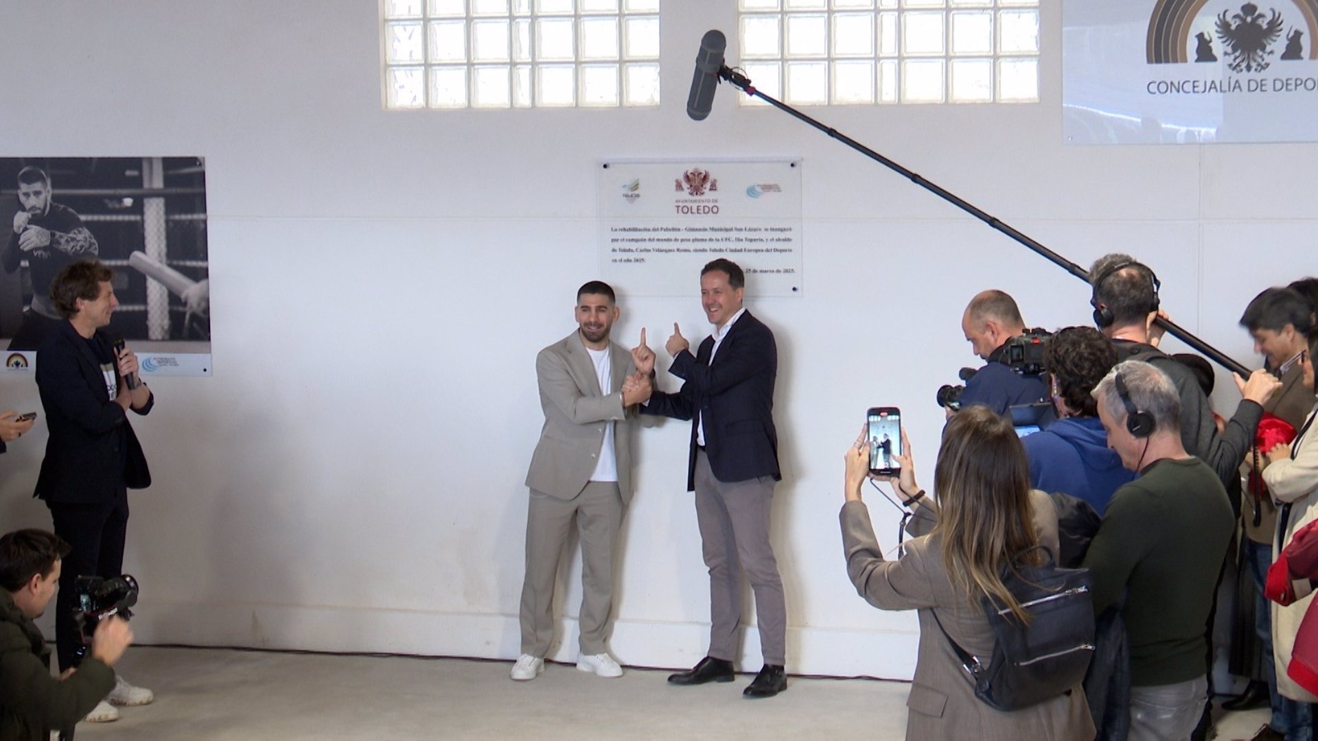 Además de descubrir junto al alcalde, Carlos Velázquez, una placa en honor al acto de reinauguración, Topuria ha regalado una de sus camisetas de entrenamiento. "Ha estado conmigo durante muchos entrenamientos y la voy a dejar aquí para que permanezca, espero que para siempre, en estas cuatro paredes".
