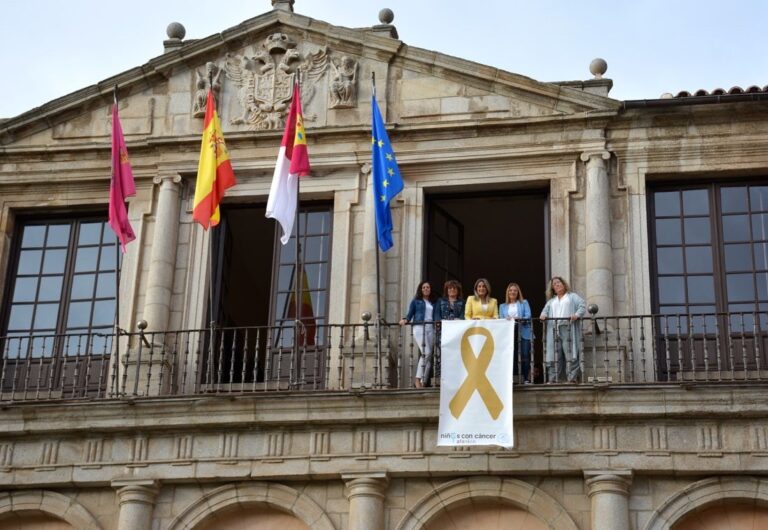 El Ayuntamiento de Toledo ha desplegado en la balconada una pancarta con el lazo dorado en apoyo a la Asociación de Familias de Niños con Cáncer de Castilla-La Mancha (Afanion) en el marco del mes de sensibilización del cáncer infantil y juvenil.