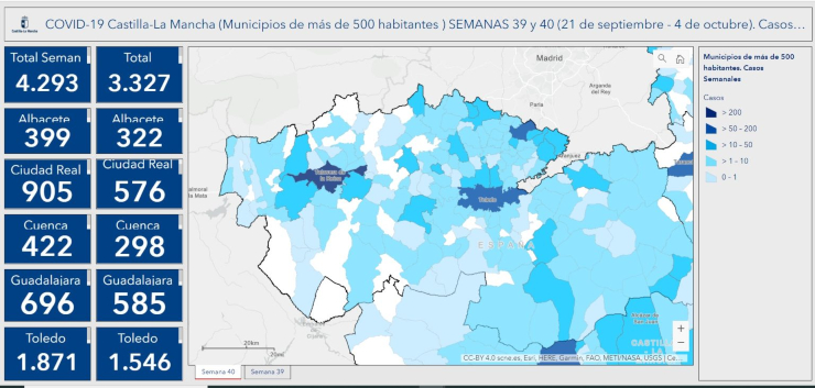 La Dirección General de Sanidad solo publica en detalle los casos positivos detectados en las mencionadas semanas en municipios con más de 500 habitantes, y no los totales desde el inicio de la pandemia. No obstante, en el mapa que han diseñado en las últimas semanas, muestran los contagios semanales y la incidencia semanal en cada uno de esos municipios, así como también el total de contagios en cada una de las cinco provincias castellanomanchegas en cada uno de esos dos períodos de siete días.
