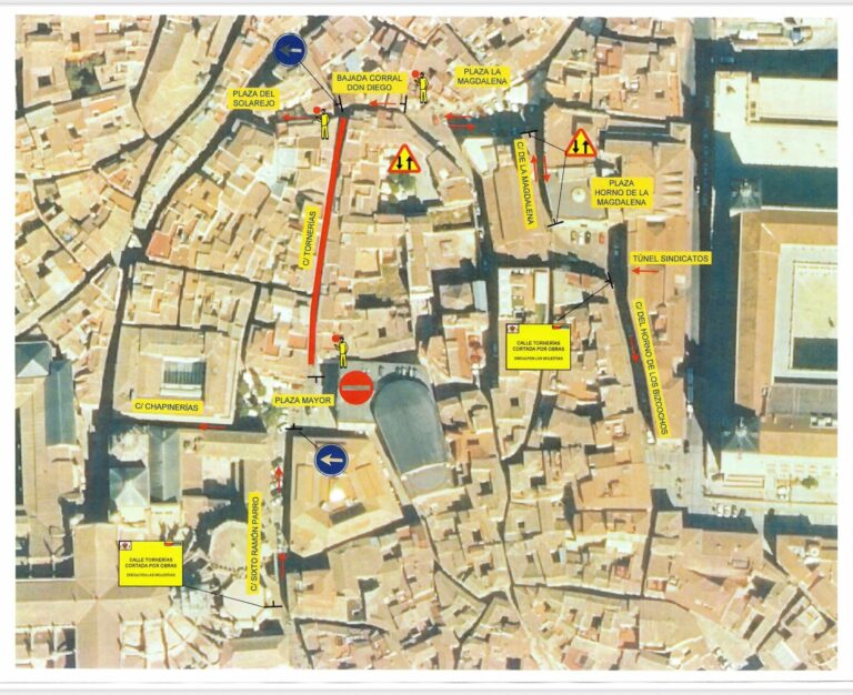 Por otro lado, el acceso hasta la plaza Mayor se realizará desde la calle Cardenal Cisneros y Sixto Ramón Parro, la cual queda con su sentido de tráfico habitual invertido. Por último, la salida desde la plaza Mayor deberá realizarse por la calle Chapinería en dirección a las Cuatro Calles.