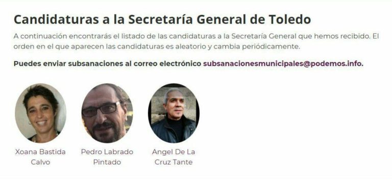 Ya se conocen las candidaturas a la Secretaría General de Podemos Toledo. Ángel de la Cruz Tante, Pedro Labrado Pintado y Xoana Bastida Calvo son los tres aspirantes a dirigir la formación morada en Toledo y sustituir en el cargo a Alfredo Díaz-Cardiel tras su dimisión hace ahora dos años.