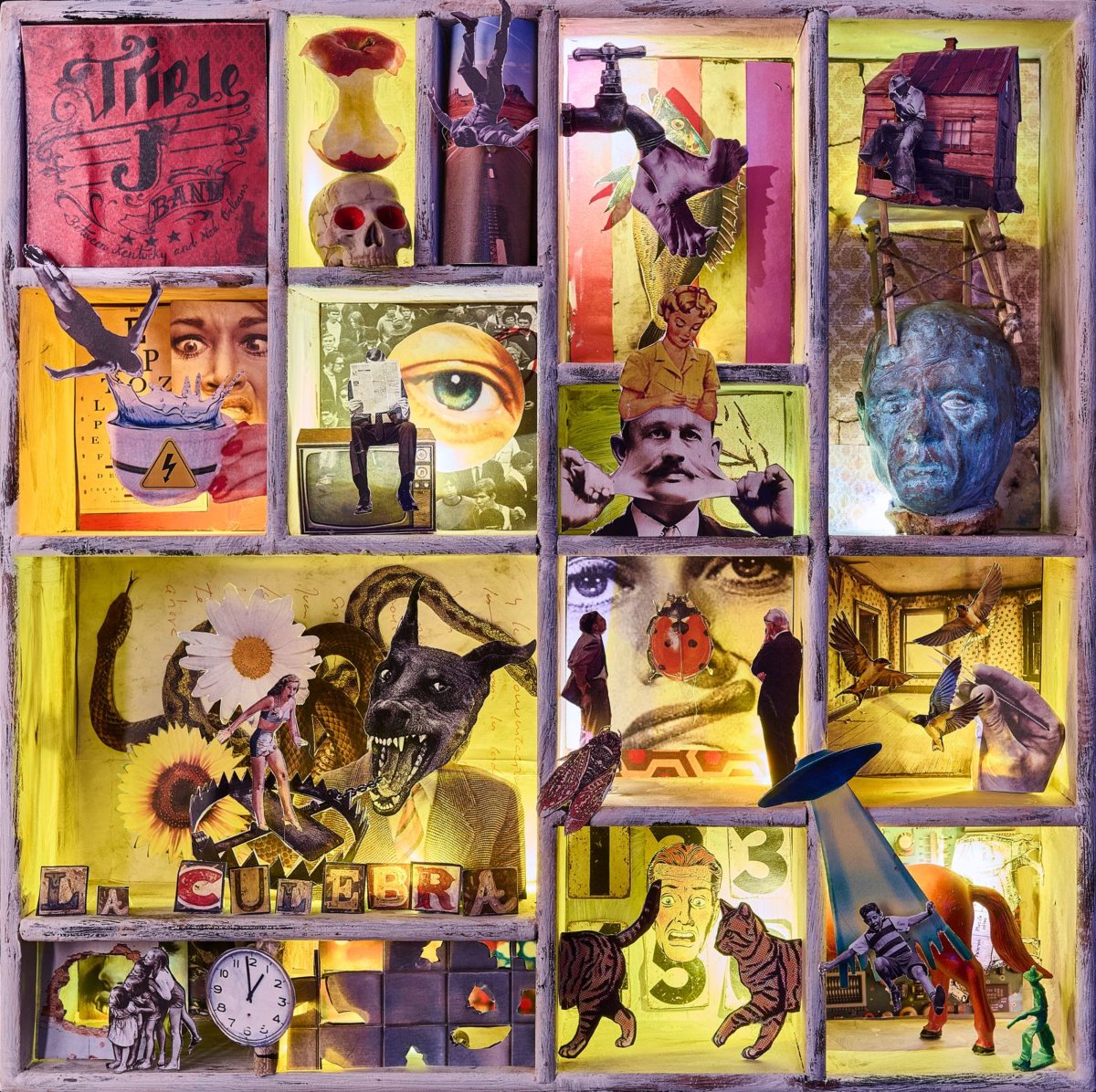 La portada del álbum, diseñada por Jairo, es también una pieza artística destacada: una fotografía de una vitrina de curiosidades (un collage en 3D). Cada pequeño cuadrado de esta vitrina funciona como alegoría de una de las canciones, invitando al oyente a jugar con el disco en la mano mientras escucha.