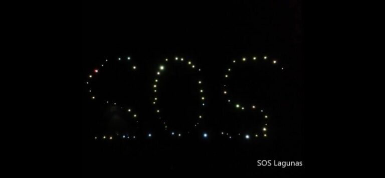 en torno a cien personas formaron un mensaje de socorro en la noche de la Laguna Grande: un SOS de luz que pretende buscar soluciones reales y definitivas para estos humedales. Soluciones que, recalcan desde Lagunas Vivas, pasan por hacer un uso más responsable del agua en la cuenca del río Gigüela, gestionada por la CHG, preservando el caudal ecológico mínimo del mismo con un Plan de Gestión.