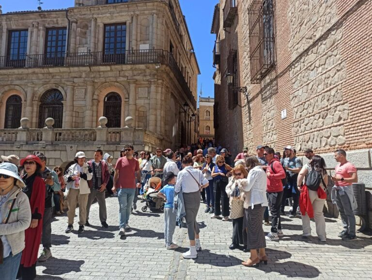 En las tiendas grandes, como Druni o la Casa de las Carcasas, todas las trabajadoras están en la puerta de los locales. En la Plaza de Zocodover, varias personas trabajan en montar lo que será a partir de este martes la primera feria de artesanía de la asociación MIA, impulsada por mujeres artesanas y que trae a trabajadores de toda España. Algunos no habían podido salir de sus casas a las 14:00 horas, porque no podían repostar sus coches. Otros ya tienen todo montado y esperan que la inauguración pueda llevarse a cabo. El estudio floral Maua, mientras tanto, adorna la plaza para crear un ambiente festivo. Los visitantes se hacen fotos con las flores y las cintas de colores que ondean sobre sus cabezas. Un perfecto día de primavera.