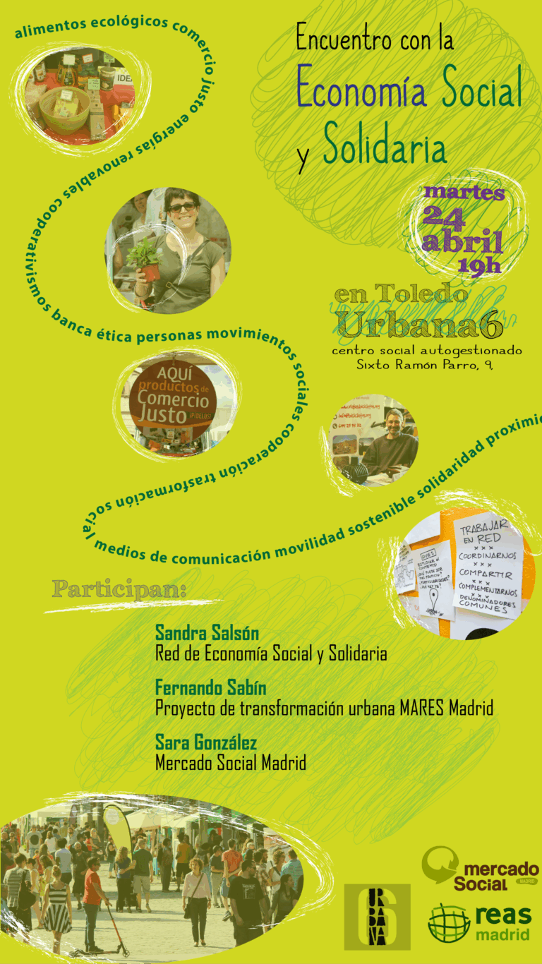 En el evento, que se desarrollar en el espacio Urbana 6 a partir de las 19.00 horas, van a intervenir Sandra Salsón, Red de Economía Social y Solidaria (REAS), y Fernando Sabín, Proyecto de Transformación Urbana MARES, para hablar de su experiencia en trabajo en red y las posibilidades de coordinación con REAS.