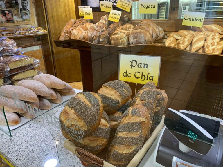Ángel Ruíz ofrecen en su panadería más de 50 variedades de pan todos ellos artesanos, con masa madre, fermentación y amasado lentos, hechos con harinas molidas a la piedra, ecológica de centeno, maíz, espelta integral, diversos tipos de cereales en su mayoría procedentes de la comarca, y cocciones bastante largas en horno de piedra alimentado con leña.