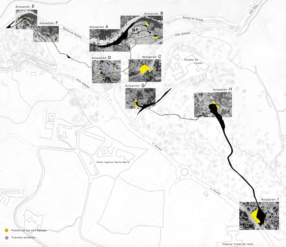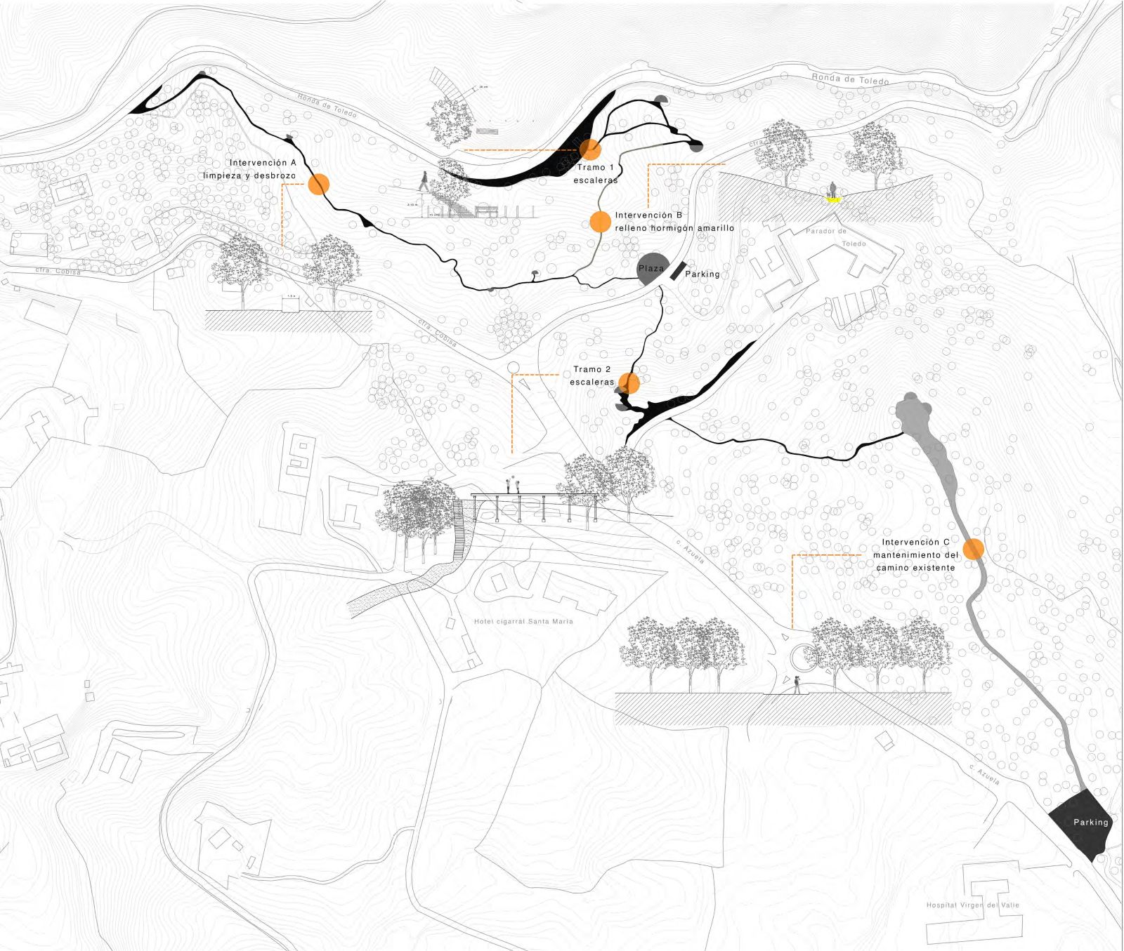 En la zona del Hospital del Valle, se ampliará y mejorará el aparcamiento superior, fomentando su uso como aparcamiento disuasorio para incentivar la circulación peatonal por el entorno natural.