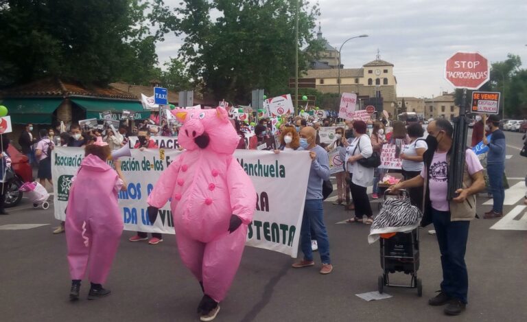 Unas 300 personas, según fuentes de la Policía Local, se han manifestado este domingo en Toledo convocadas por la plataforma Stop Macrogranjas en Castilla-La Mancha con el objetivo de exigir al Gobierno regional que apruebe una moratoria a los proyectos de ganadería industrial.