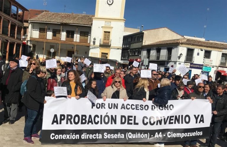 Alrededor de 300 personas, convocadas por la Asociación de Vecinos el Quiñón de Seseña (Toledo), la Corporación municipal seseñera y la sociedad civil de la localidad, se han manifestado este sábado en la localidad madrileña de Ciempozuelos para reclamar "un acceso digno y seguro" a la autovía A-4 para este municipio toledano.