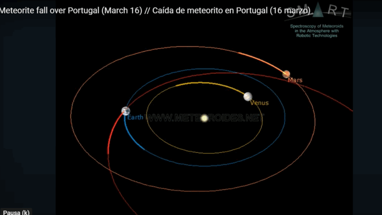Estas rocas que se cruzan con la órbita de la Tierra reciben el nombre de “meteoroides”. El brusco rozamiento de la roca con la atmósfera a esta enorme velocidad hizo que la roca (el meteoroide) se volviese incandescente, generándose así una bola de fuego que se inició a una altitud de unos 91 kilómetros sobre la localidad portuguesa de Foros de Vale Figueira, al oeste de la región de Évora.