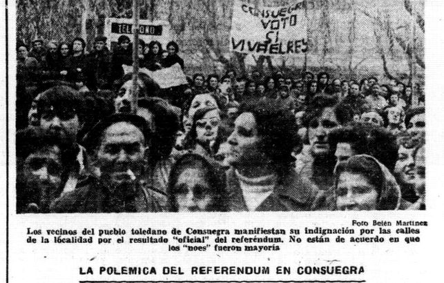 Pero el apabullante éxito del apoyo a la Ley se rompía en Consuegra, una población de Toledo de 10.000 habitantes donde, al menos oficialmente, ganó el ‘no’. Los lugareños, que en su mayoría y según sabían casi todos ellos, habían respaldado la norma, ante las fundadas sospechas de manipulación de los resultados, se echaron a la calle y protagonizaron unas de las manifestaciones vecinales más importantes del municipio.