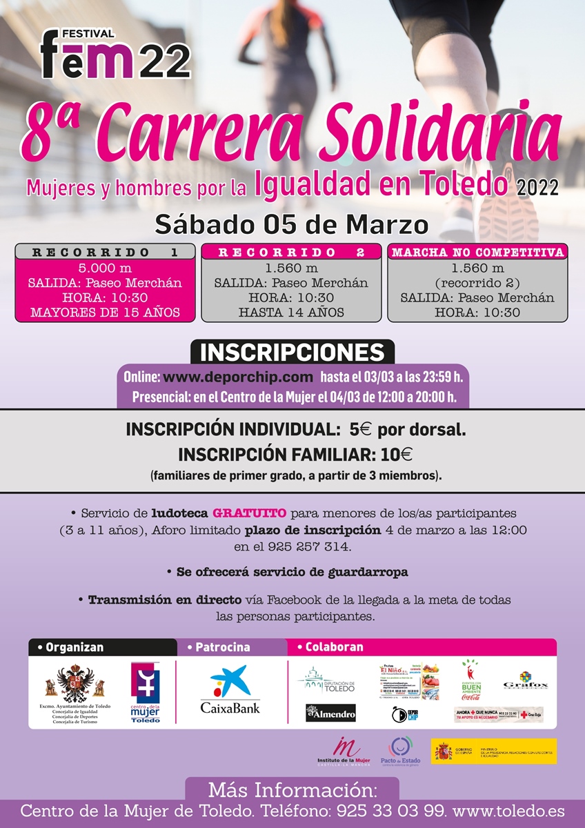 El plazo de inscripción para participar comienza este viernes, 18 de febrero, y finaliza el 3 de marzo a través del portal www.deporchip.com. Además, el 4 de marzo se habilitará inscripción presencial de 12 a 20 horas en el Centro de la Mujer de Toledo.