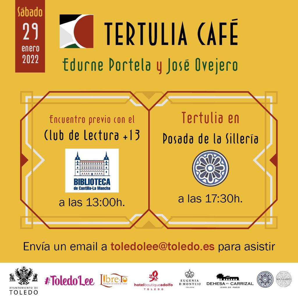 Los escritores Edurne Portela y José Ovejero serán los protagonistas de la tertulia literaria que se celebrará en el Hotel Posada de Sillería este sábado, 29 de enero, a las 17.30 horas. Para asistir es necesario enviar un email al correo electrónico toledolee@toledo.es.